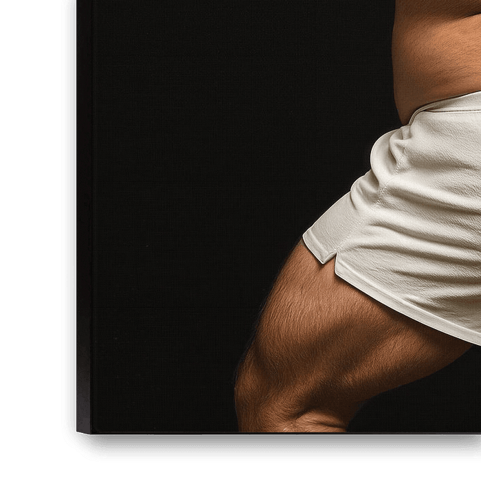 Koop de foto Gespierde man in witte short, achteraanzicht van Markus Gann op canvas, aluminium dibond, (ingelijste) fotoprint, behang en ArtFrame, op maat geprint in Fine-Art kwaliteit.