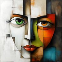 Dit schilderij toont een abstract portret van een gezicht, verdeeld in geometrische vlakken en verschillende kleuren. De linkerhelft van het gezicht heeft een groen oog en is afgebeeld met een licht palet van witte, grijze en beige tinten, terwijl de rechterhelft een oranje oog heeft en voornamelijk warme tinten zoals rood, oranje en bruine schakeringen gebruikt. Het gezicht is opgebouwd uit strakke, rechthoekige vlakken die de vormen onderbreken en herdefiniëren, wat een gevoel van fragmentatie en contrast oproept. De combinatie van organische vormen, zoals de ogen en lippen, met geometrische abstractie geeft het werk een dynamisch, modern en intrigerend karakter. Het lijkt te verwijzen naar thema's van dualiteit, balans, en misschien een spanning tussen verschillende identiteiten of emoties.