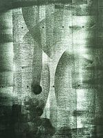 Een abstract schilderij met geometrische vormen in een vergrijsd groene kleur. Het kunstwerk bestaat uit allerlei kleine cirkeltjes.