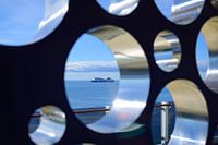 Het gloednieuwe cruiseschip Norwegian Prima heeft een heleboel zeer interessante kunstwerken op een van de dekken. Als fotograaf was het leuk om hiermee te spelen. Dit specifieke abstracte kunstwerk heeft honderden gaten. Ik vond het prachtig hoe de veerboot in één ervan werd gevangen.