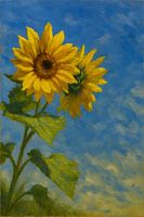Twee zonnebloemen wiegen zacht in het licht van een zomerdag, hun gouden kronen open als zonnen zelf, stralend tegen de hemel die smelt van blauw. De penseelstreken ademen warmte en leven — dik, vol textuur, alsof de verf nog trilt van de hand van de schilder. De voorste bloem buigt zich trots naar het licht, haar hart donker en vol zaden van belofte, terwijl de tweede, iets verscholen, haar schaduw deelt in een stille dialoog van groei en vergankelijkheid. De lucht, geschilderd in vegen van kobalt en wit, lijkt te bewegen, als een adem van eeuwigheid. Dit tafereel is geen momentopname, maar een lofzang aan het licht zelf — een herinnering aan de vreugde van het bestaan, eenvoudig en groots tegelijk, gevangen in de taal van olieverf.