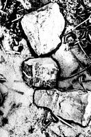 Een foto in zwart-wit. Drie stenen op een rommelige achtergrond.