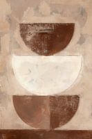 Dit werk toont drie halfcirkelvormige vormen die als schalen op elkaar balanceren. De gelaagdheid creëert een subtiel ritme, waarin schaduw, textuur en leegte elkaar afwisselen. De bovenste schaal is ruw en korrelig, de onderste zachter en egaler, wat een harmonieus spanningsveld oproept tussen materialiteit en stilte. De compositie is perfect uitgebalanceerd en versterkt door een zorgvuldig gekozen tactiele achtergrond.