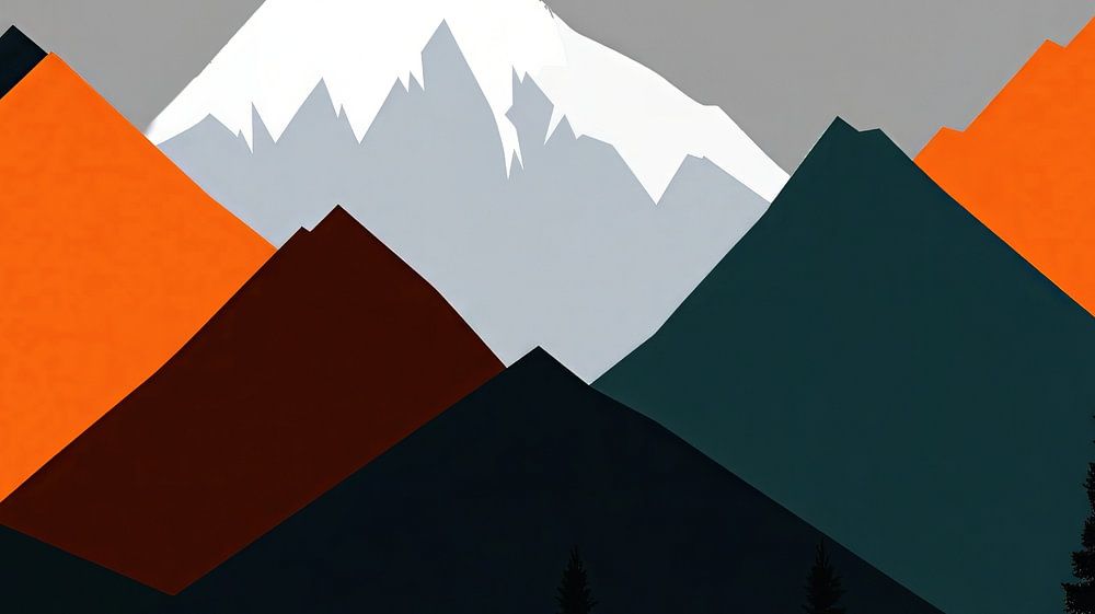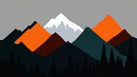 Deze gestileerde illustratie toont een indrukwekkend bergmassief met fel oranje gekleurde toppen die in fascinerend contrast staan met een besneeuwde top. Een donker, silhouetbos strekt zich uit op de voorgrond en benadrukt het dramatische effect van het landschap. De felle kleuren en heldere vormen geven de scène een zekere abstractie, terwijl de majestueuze bergen en het zachte sneeuwdek een kalme maar krachtige sfeer creëren. De compositie is een perfect samenspel van rust en drama en vangt de adembenemende schoonheid van de natuur op een unieke manier. Deze illustratie is ideaal voor iedereen die de majestueuze rust van de bergen en de krachtige weergave van natuurverschijnselen waardeert.