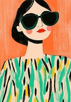 Een gestileerde illustratie van een vrouw met een zwarte bob die haar gezicht en voorhoofd gedeeltelijk bedekt. Ze draagt een grote donkergroene zonnebril met een dik montuur, glanzend rode lippen en zachtroze wangen. Haar mouwloze top heeft een patroon van zwarte en groenblauwe strepen en abstracte gele en groenblauwe vormen. De…