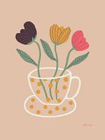 Deze charmante illustratie toont een gestippelde kop en schotel met drie speelse bloemetjes in roze, okergeel en diep bordeauxrood. Een vrolijke en frisse toevoeging aan je interieur, perfect voor de keuken, een koffiehoekje of als cadeau voor een theeliefhebber. 🌸☕✨
