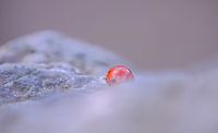 Lieveheersbeestje op pad, half verscholen achter een steen.