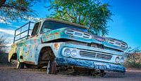 Gestrand in de woestijn, oldtimer. 4 x 4 terreinwagen. In Namibie vind je overal onderweg achtergelaten onderdelen van auto's en autowrakken.