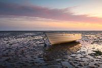 Dit gestrande vissersbootje op een drooggevallen slik aan de Oosterschelde vormde een mooi onderwerp voor een foto. Tezamen de gekleurde lucht en het zachte licht van de opkomende zon maken dit een aangename plaat om naar te kijken.