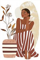 Achter haar zweeft een beige cirkel — zacht, bijna zonachtig — die de scène een gevoel van tijdloosheid geeft. Het is geen zon, geen maan, maar iets ertussenin: een symbool van centrering, van het midden waar beweging tot rust komt. Naast haar staat een pot, eveneens gestreept, met een plant die voorzichtig groeit — alsof de natuur zelf probeert te antwoorden op het menselijke verlangen naar structuur en schoonheid.
