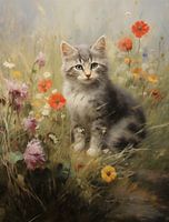 Over ‘Gestreepte Kitten in Kleurrijk Bloemenveld’ van Emil Husstege