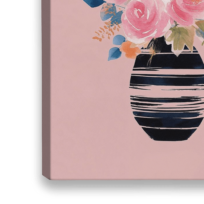 Koop dit bloemen kunstwerk Gestreepte Vaas met Bloemen in Navy en Roze no.2 van Studio BB op canvas, aluminium dibond, (ingelijste) fotoprint, behang en ArtFrame, op maat geprint in Fine-Art kwaliteit.