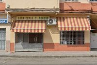 Dit fotografische, stedelijke stadsmotief van een typische slagerij met gestreepte luifels werd op 25 augustus 2025 genomen met de NIKON D800 camera (lens: NIKKOR) tijdens mijn eerste bezoek aan Andalusië.