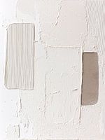 de kracht van eenvoud en textuur in een haast meditatieve abstractie. In een palet van wit, crème en lichtgrijs worden rechthoekige en afgeronde vormen in dikke lagen materiaal op het doek aangebracht. De opbouw bestaat uit contrasterende texturen: gladde vlakken met paletmes, fijne groeven in verticale richting, en korrelige…