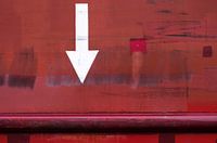 Een witte pijl geschilderd op de romp van een vrachtschip. Het beeld spreek mij aan door de vele structuren en verflagen.