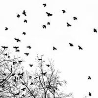Groep Kouwtjes vliegt tegelijkertijd weg uit een boom. Het lijkt wel alsof ze uit het kader van de foto vliegen wat een mooi grafisch beeld op levert en in Zwart Wit komt deze foto het beste tot z'n recht.