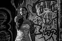 Deze zwart-witfoto straalt een krachtige mix van contrast en emotie uit. Een vrouw staat in een stedelijke, rauwe omgeving vol graffiti, terwijl ze een vuurwapen op de camera richt. Haar houding is zelfverzekerd, bijna uitdagend, en haar blik straalt zowel vastberadenheid als een zekere vermoeidheid of melancholie uit.
