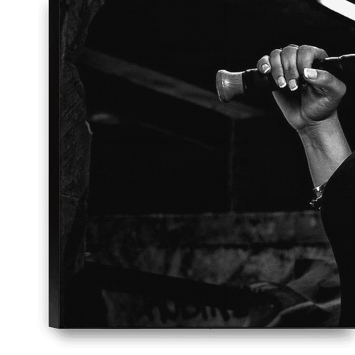 Deze zwart-witfoto toont een vrouw met een intense en zelfverzekerde uitstraling. Ze staat in een ruige, stedelijke omgeving vol graffiti, wat een sfeer van rebellie en kracht oproept. In haar hand rust nonchalant een honkbalknuppel met de tekst "Super Bat", wat haar een gevaarlijke en onverschrokken uitstraling geeft.