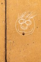 Deze verweerde gele muur viel op door de tekening van het hoofd.