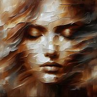 Dit fascinerende olieverfwerk in warme tinten bruin en goud toont een vrouw met lang, golvend haar dat speels over haar gezicht valt. De zachte beweging van de lokken creëert een mysterieus en dromerig effect, terwijl de gouden accenten het licht vangen en een bijna magische gloed uitstralen. De combinatie van vloeiende lijnen en rijke…