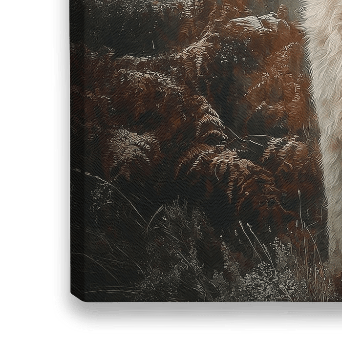 Dit schilderij toont twee Sint-Bernard honden die zij aan zij in een mistig bos zitten, omringd door herfstkleuren en een zachte sluier van nevel. Hun imposante gestalte en warme, dikke vacht geven een gevoel van kracht en zachtheid tegelijk. De ene hond kijkt aandachtig in de verte, terwijl de andere met kalme waardigheid naast hem zit…