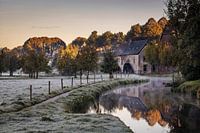 Een mooie koude zonsopgang bij de watermolen van Wijlre in het Zuid-Limburgse Heuvelland. Het rustige weer zorgt voor een strak wateroppervlak en een optimale reflectie.
