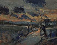 Rivier de Geul omzoomt met knotwillgen in het Zuid Limburgse Heuvelland nabij Cottessen aan het einde van de dag. Een prachtig landschap in blauwen en oranje.