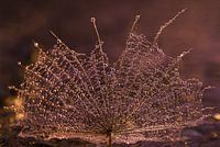 "Gevallen pluisje van een Morgenster (Tragopogon) " is een macrofoto van waterdruppels aan een pluisje van een Morgenster. Deze (bewerkte) foto heeft voornamelijk roze / paars en beige / champagnekleur. Door het licht en de kleuren ontstaat een aparte, spannende sfeer.