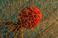"Gevangen in een kooi van goud met turquoise achtergrond" is een (extreme) macrofoto van een lampionnetje van de lampionplant, die al voor een deel verteerd is. Hierdoor is van de buitenkant van het lampionnetje bijna alleen nog maar de nervenstructuur overgebleven.