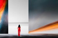 Het ankerpunt van de foto is een vrouw met haar rug naar de kijker in een streng gecomponeerde, bijna surrealistische omgeving. Ze draagt een levendig rood - de kleur van energie, leven, misschien ook van innerlijke onrust. Haar houding is stevig, haar houding rechtop - en toch lijkt ze geïsoleerd, ingekaderd tussen duidelijk gescheiden picturale ruimtes.