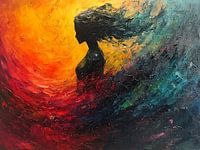 Het schilderij bruist van expressie, met een vrouw als middelpunt in vurige rood, geel en blauw tinten. De kleuren zwieren wild om haar heen, als vlammen in beweging, en lijkt op te lossen in de achtergrond van kleur en energie. De penseelstreken zijn krachtig en los, vol ritme en emotie. Haar silhouet is deels abstract, maar haar…