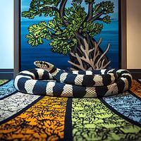 Een gestreepte slang rust in stille heerschappij op een patroonoppervlak dat zowel de natuur als design weerspiegelt. Daarachter vervagen een levendig kustlandschap en een eenzame boom de grens tussen realiteit en illustratie – het blauw van de oceaan, levendig groen en grafische texturen versmelten tot een gelaagd visueel…