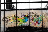 De foto toont een kleurrijke graffiti van een vogel die in levendige tinten op de verweerde muur van het voormalige sanatorium is gespoten. De levendige kleuren van de vogel - groen, blauw, geel en oranje - contrasteren sterk met de bleke en afbladderende muur erachter. De scène wordt gedomineerd door tralies op de voorgrond, die fungeren als een symbolische grens en de vrijheid van de vogel beperken. Dit motief doet denken aan de geschiedenis van het sanatorium, dat ooit diende als longsanatorium voor mijnwerkers en later werd gebruikt als militair hospitaal tijdens de Tweede Wereldoorlog.