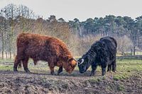 Gevecht tussen zwarte en bruine Schotse Hooglander van Ben Schonewille