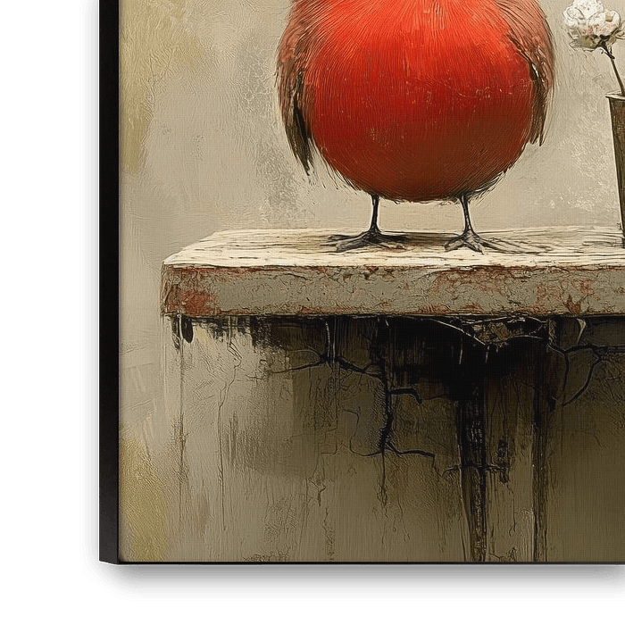 Dit schilderij toont een groepje eigenzinnige gevederde vrienden die klaar lijken voor hun allereerste 'Vogelbloemwedstrijd'. Aan de linkerkant hebben we 'Rode Robbie', die met zijn vurige kuif net doet alsof hij de jury al heeft omgekocht met zijn flamboyante verschijning. In het midden staat 'Blauwe Bob', die er een beetje verward uitziet, alsof hij zich afvraagt waarom hij in hemelsnaam een bloem in een pot moet beoordelen in plaats van wormen te zoeken. En helemaal rechts hebben we 'Gele Gerrit', die serieus zijn best doet om professioneel te kijken, maar ondertussen al plannen maakt om die sappige bbloem bovenop te pikken zodra niemand kijkt. Samen vormen ze een vrolijk, enigszins verward trio dat humor brengt in menig interieur.