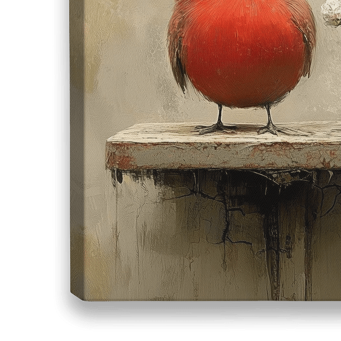 Dit schilderij toont een groepje eigenzinnige gevederde vrienden die klaar lijken voor hun allereerste 'Vogelbloemwedstrijd'. Aan de linkerkant hebben we 'Rode Robbie', die met zijn vurige kuif net doet alsof hij de jury al heeft omgekocht met zijn flamboyante verschijning. In het midden staat 'Blauwe Bob', die er een beetje verward uitziet, alsof hij zich afvraagt waarom hij in hemelsnaam een bloem in een pot moet beoordelen in plaats van wormen te zoeken. En helemaal rechts hebben we 'Gele Gerrit', die serieus zijn best doet om professioneel te kijken, maar ondertussen al plannen maakt om die sappige bbloem bovenop te pikken zodra niemand kijkt. Samen vormen ze een vrolijk, enigszins verward trio dat humor brengt in menig interieur.