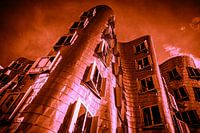 Gevel Gehry gebouwen in Düsseldorf Duitsland met vervreemding in rood