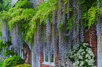 Deze gevel met trossen blauweregen heb ik gefotografeerd in de Cotswolds in Engeland. Karakteristieke lage landelijke huisjes met rode bakstenen muren overgroeid met klimplanten.