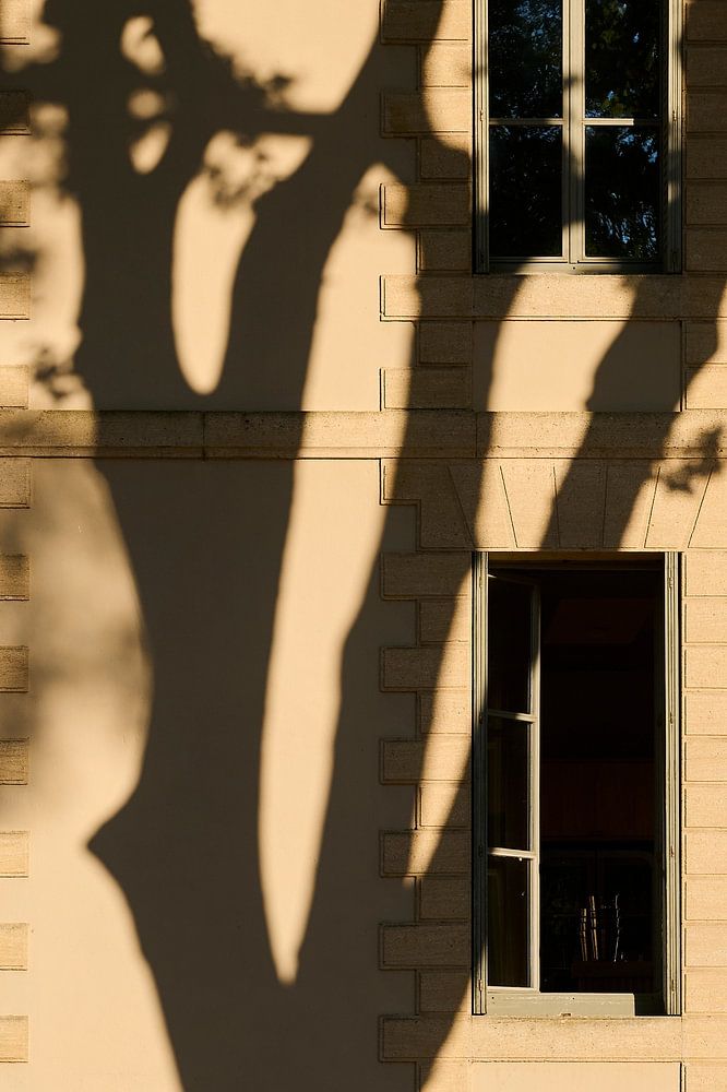 Aan het einde van de dag ontstaat er een mooi schaduwspel op de gevel van een restaurant in Vers-Pont-du-Gard, Frankrijk.