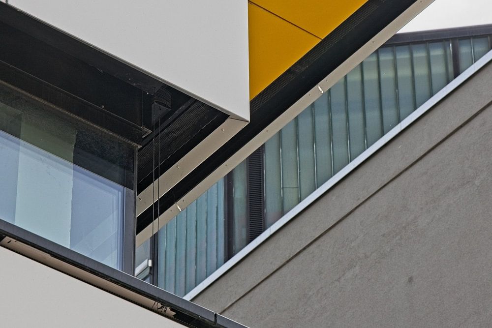 Strakke gevelbeplating en terugvallende raampartijen zorgen voor een spannend, haast abstract, lijnenspel in deze gebouwen op het RWTH terrein in de stad Aken (Duitsland).