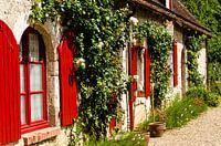 Koop de foto Gevel stenen huis met rode luiken en groen in Fougères sur Bièvre Loire Frankrijk van Dieter Walther op canvas, aluminium dibond, (ingelijste) fotoprint, behang en ArtFrame, op maat geprint in Fine-Art kwaliteit.