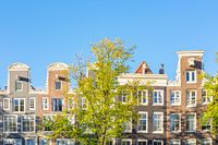 Traditionele oude gevels op grachtenpanden langs de grachten in Amsterdam, hoofdstad van Nederland. De oude koopmanshuizen staan in de grachtengordel in het stadscentrum en zijn vaak gebouwd in de Gouden Eeuw.