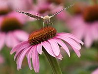 Een distelvlinder proeft de nectar van de paarse echinacea bloem.