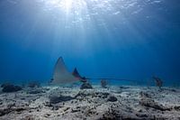 Een van mijn favoriete dieren om te zien onderwater . Ze zwemmen heel elegant en rustig maar zijn heel lastig om bij te houden. Deze rog kwam ik tegen in Turks & Caicos tijden een vrij duik sessie. De zon ging a langzaam naar beneden waardoor ik door het heldere water de zonnestralen mooi vast kon leggen. Turks & Caicos is een eilanden groep naast de Bahamans en staat bekend voor haar blauwe en heldere water wat goed te zien is op de foto. Dit is een zweer foto wat heel goed zou passen in een woonkamer, hotel kamer, keuken of zelf een buiten tuin. De diepe blauwe kleuren komen mooi tot zijn recht met de zonnestralen op de achtergrond.