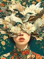 Centraal staat het gezicht van een vrouw, haar blik verborgen achter een sluier van prachtige witte bloemen en diverse vogels. Deze elementen van flora en fauna zijn rijk gedetailleerd en geven blijk van een diepe verbondenheid met de natuur. De vogels, gedetailleerd en levendig, lijken in perfecte harmonie te zijn met de bloemen, alsof ze één worden met de vrouw. Het patroon van haar kleding, rijk aan kleur en detail, vloeit samen met de natuurlijke elementen, wat het beeld een naadloze, organische kwaliteit geeft.