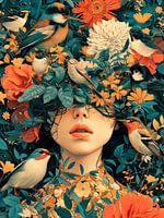 Het gezicht van een jonge vrouw wordt omlijst door een diversiteit aan vogels en bloemen, waardoor een levendige en kleurrijke compositie ontstaat. De vrouw lijkt in harmonie met de omringende natuur; haar ogen zijn gesloten, wat een gevoel van innerlijke rust en contemplatie oproept. De vogels zijn rijk gedetailleerd, met een variëteit aan kleuren en soorten die nauwkeurig en liefdevol zijn afgebeeld. De bloemen vullen de ruimtes tussen de vogels op, wat bijdraagt aan de weelderige en volle indruk van het geheel.