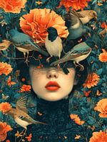 Grote, levendige oranje bloemen omringen haar, terwijl een verscheidenheid aan vogels – elk met een eigen, gedetailleerd verenkleed – tussen de bloesems door lijkt te fladderen en te rusten. De kleuren zijn diep en verzadigd, waardoor een sterk contrast ontstaat met de bleke huid van de vrouw en haar markante rode lippen. Haar gesloten ogen suggereren een staat van dromerige introspectie of een diepe verbinding met de natuurlijke elementen die haar omgeven.