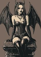 Een verleidelijke vrouw met vleermuisvleugels en hoorns zit op een stenen sokkel. Ze draagt een uitgebreid ontworpen korset en staart met donkere elegantie in de verte. Haar verschijning is demonisch en mysterieus, ingebed in een gotische esthetiek met donkere kleuren en fijne ornamentele details.