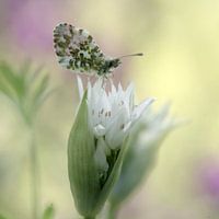 Een knop wilde knoflook in een beukenbosje waarop een kleine vlinder is geland.
