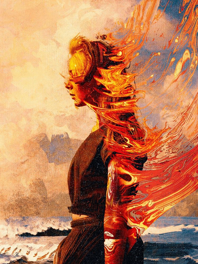 Een figuur staat aan de kustlijn, vlammen van licht stijgen op uit zijn lichaam en versmelten met de lucht. Gemaakt als een uitdrukking van innerlijke kracht en transformatie, vangt het de ontmoeting tussen menselijke emotie en elementaire kracht. Het werk heeft een dramatische maar hoopvolle sfeer, krachtig in elk interieur.